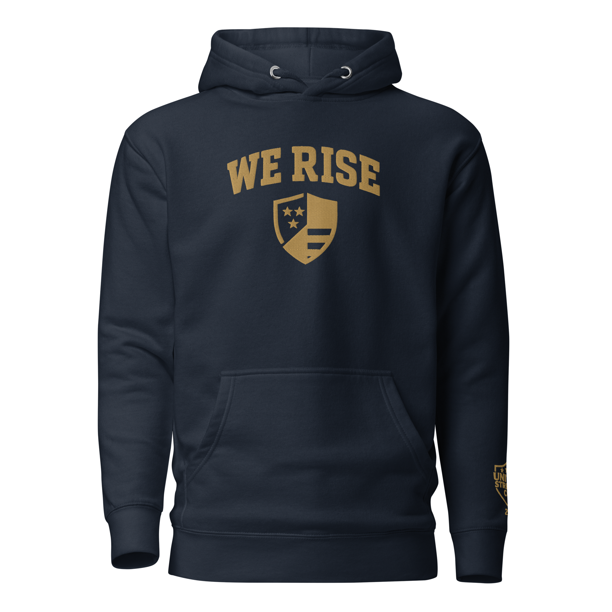 Crafted from premium heavyweight cotton-blend fleece, this piece pairs classic collegiate design with modern streetwear energy. The bold “WE RISE” arch and shield emblem, embroidered in rich old gold against deep navy, mark a statement of grit and purpose.