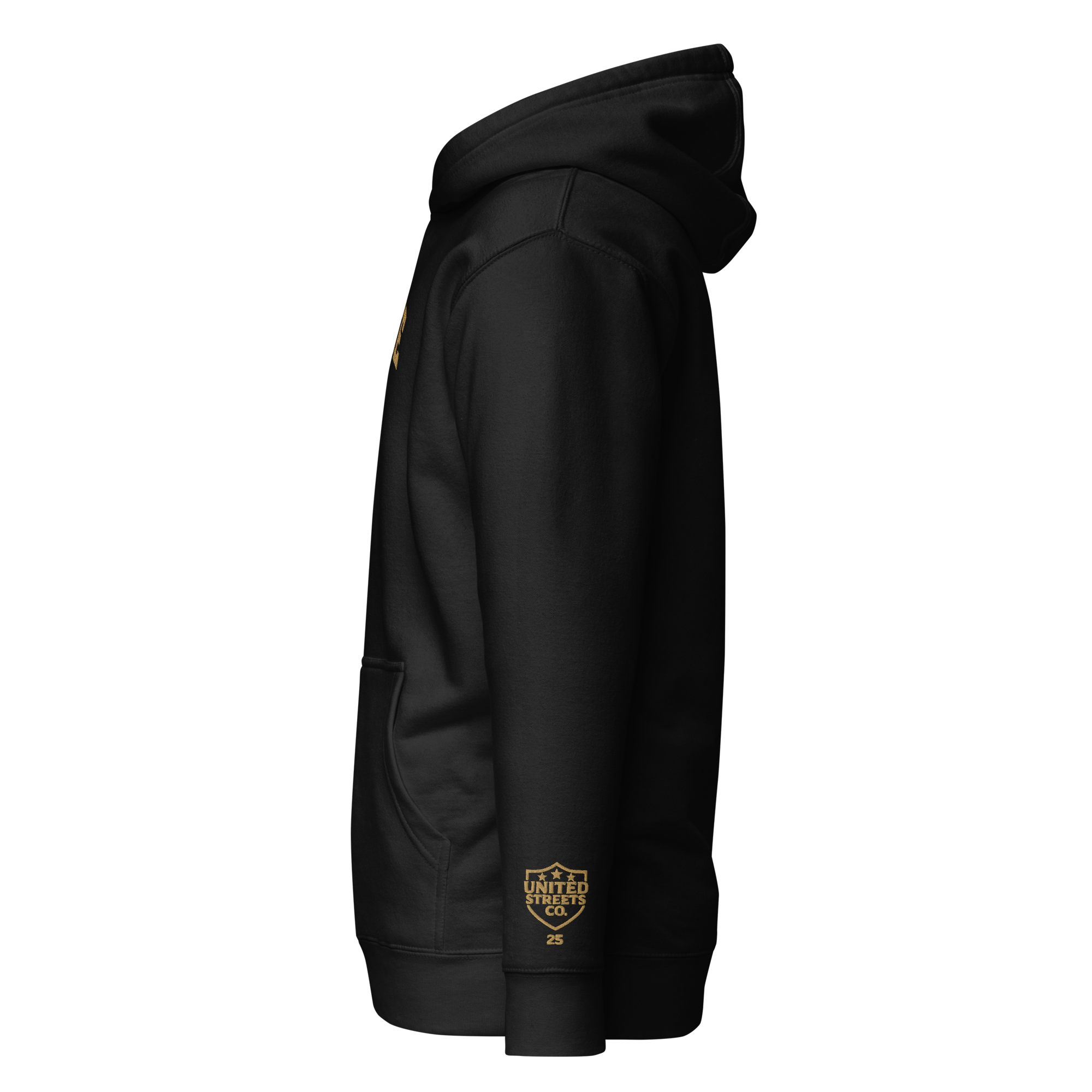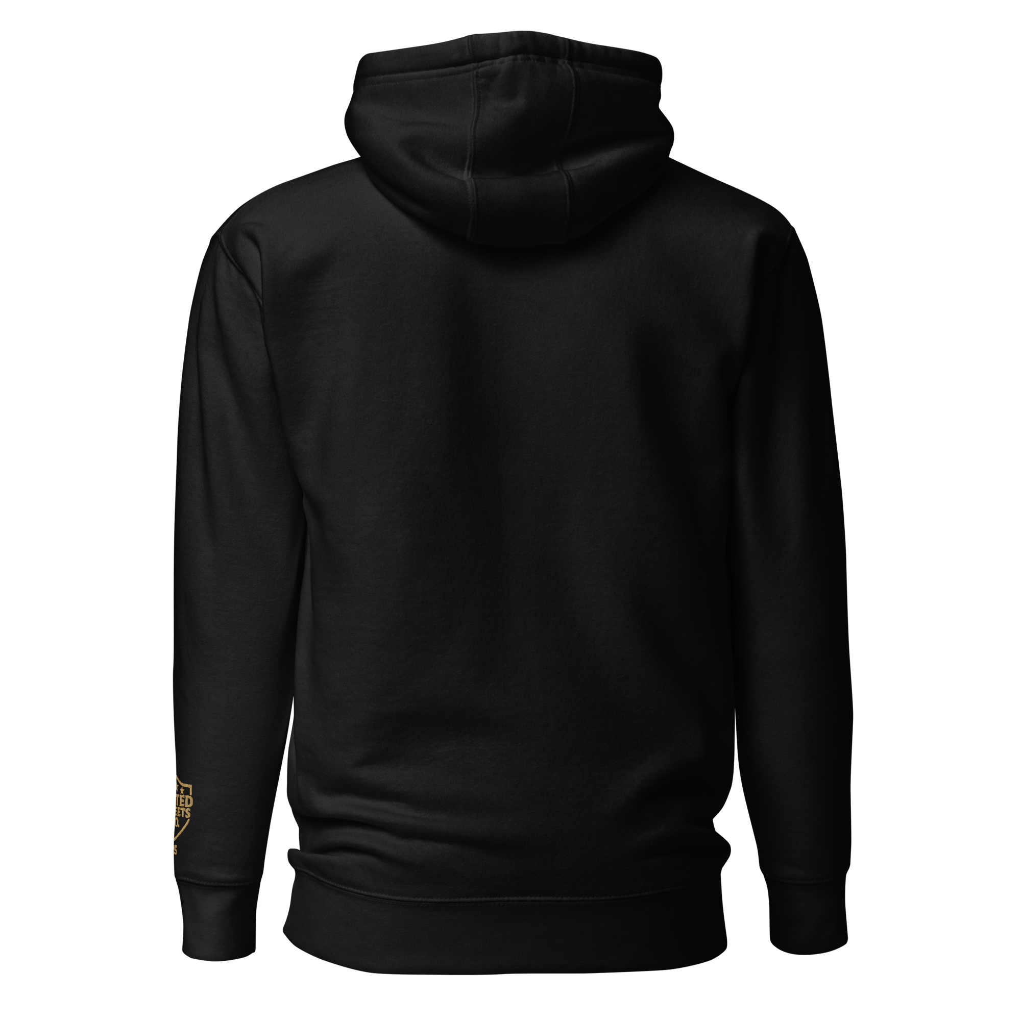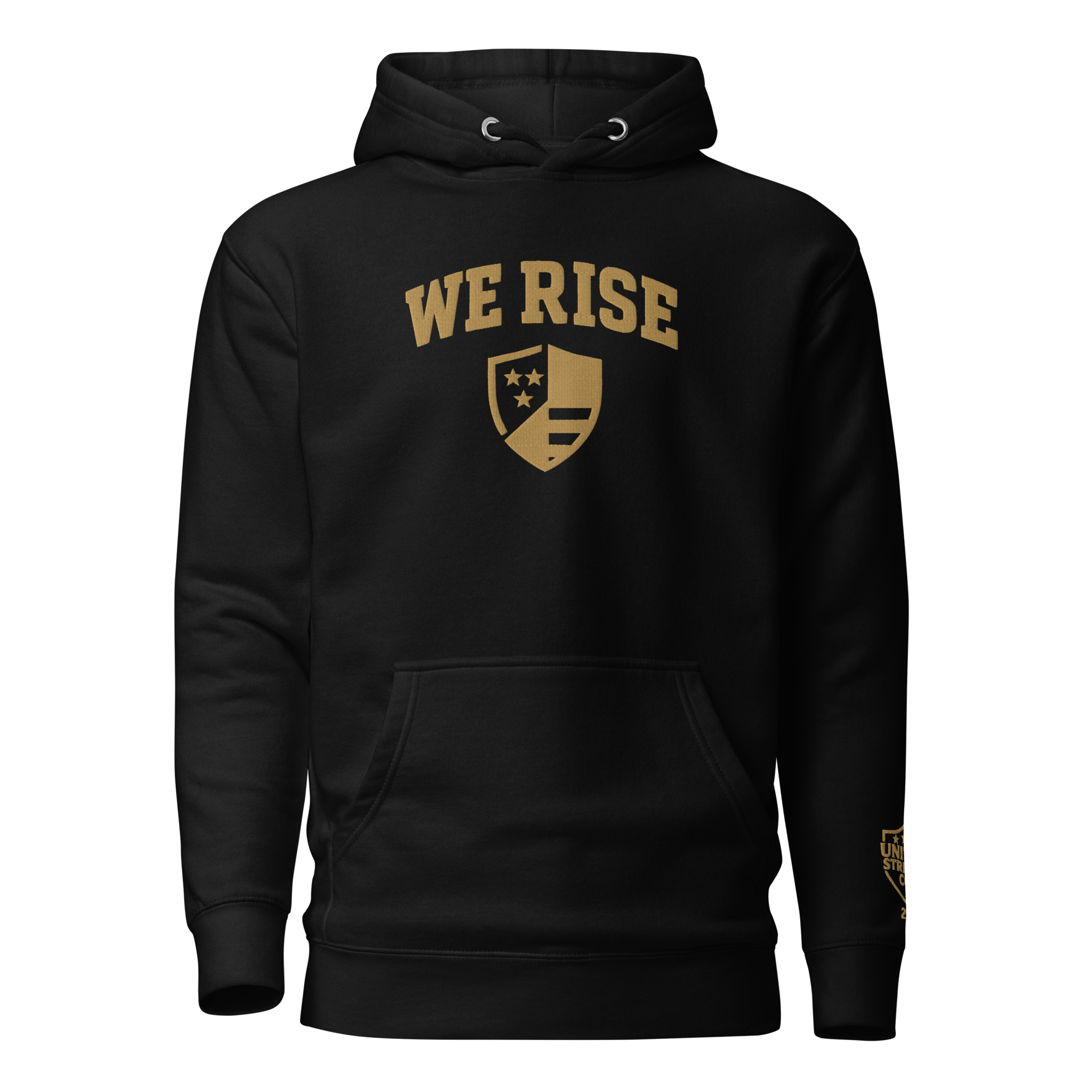 Crafted from premium heavyweight cotton-blend fleece, this piece pairs classic collegiate design with modern streetwear energy. The bold “WE RISE” arch and shield emblem, embroidered in rich old gold against a black background, mark a statement of grit and purpose.