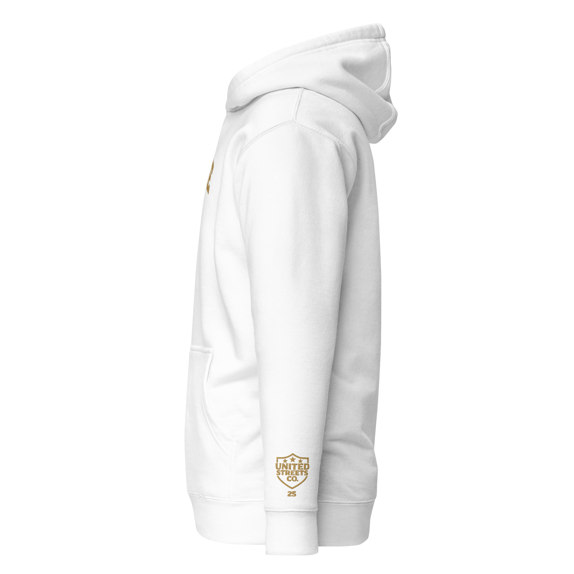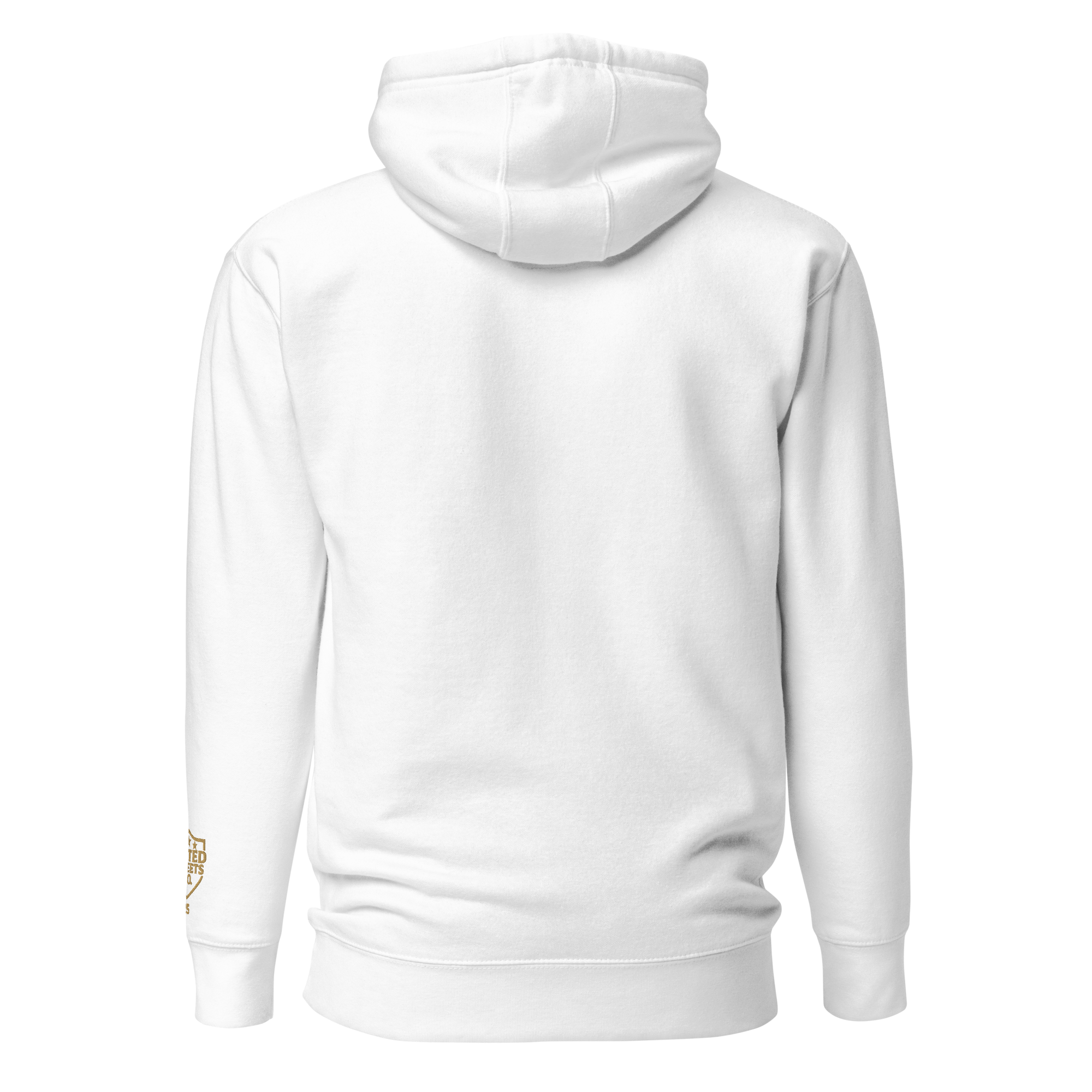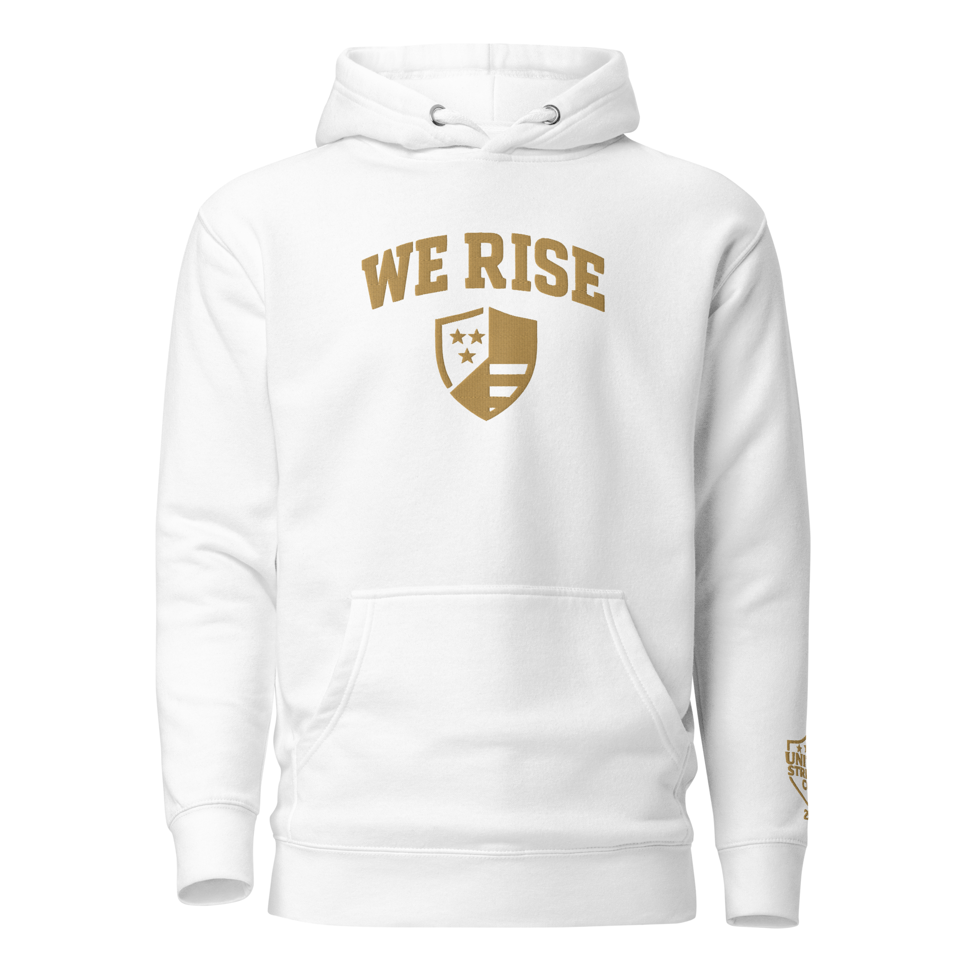 Crafted from premium heavyweight cotton-blend fleece, this piece pairs classic collegiate design with modern streetwear energy. The bold “WE RISE” arch and shield emblem, embroidered in rich old gold against white background, mark a statement of grit and purpose.